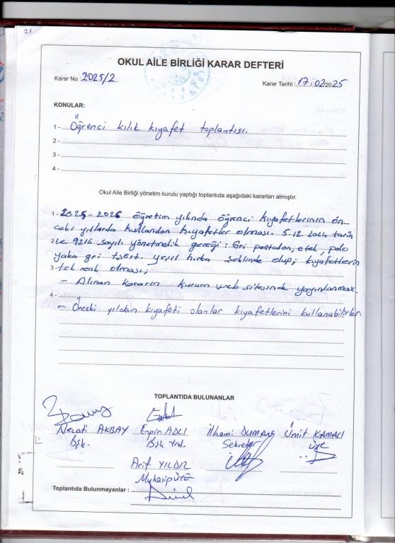 Millî Eğitim Bakanlığına Bağlı Okul Öğrencilerinin Kılık ve Kıyafetlerine Dair Yönetmelik kapsamında okul kıyafet/forması; pamuklu/yünlü, sağlıklı ve nitelikli malzemelerden, dayanıklı, hareket serbestliğini kısıtlamayan rahat kalıplı, yaş/sınıf seviyesine, okul türüne ve öğrencilerin fiziksel gelişimine uygun olacak şekilde aşağıda belirtilen standartlara uygun olarak Bakanlığımızın 5.12.2024 tarih ve 9216 sayılı yönetmeşiği gereği , 17.02.2025 Okul Aile Birlliği Kararı ile belirlenmiştir.